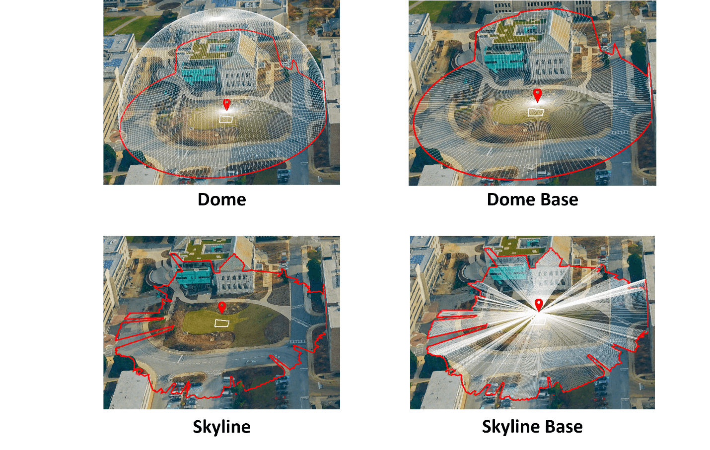 Output of the tool. Select one of the options for representing the visible area from the threat point. The threat dome is made up of a center point representing the viewer, a ring that circumscribes the area that can be seen, and in some a dome and/or base. § Dome – A spherical dome is generated that encloses all points that can be viewed from the dome’s viewpoint. § Dome base – A circular surface is generated defining the area below which all points are not visible from the dome's viewpoint. § Skyline – An outline of the visible terrain and objects is generated, highlighting any objects (e.g., buildings or mountains) that block the viewpoint's field of view. § Skyline base – An outline of the visible terrain and objects is generated, with lines extending from the viewer to the ring. |