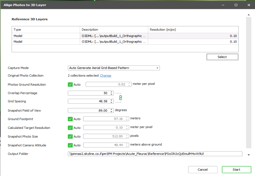 § In Auto-Generate Aerial Grid-Based Pattern mode, the reference snapshots are based on the camera angles and flight path of the original photo capture, used to generate the project’s mesh. The selected collections are used to calculate the ground footprint and resolution of the reference snapshots.