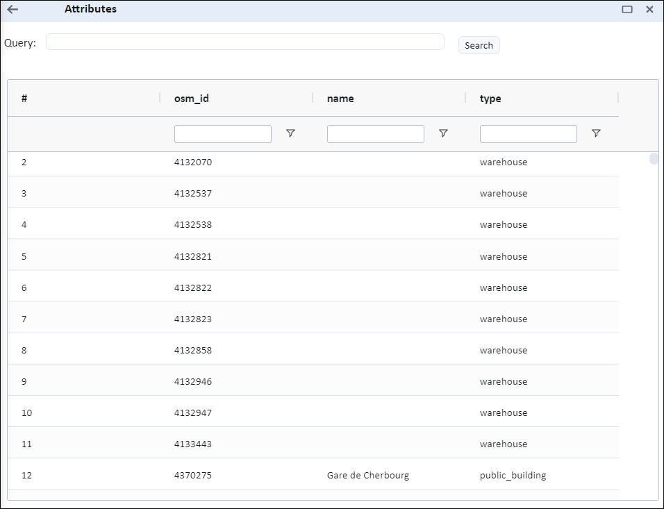 b. In the Search query field, enter an attribute, operator, and value and click Search. Your search results are displayed in the search results list. A maximum of 200 features are displayed. To fly to a feature, double-click the feature’s row in the attribute table.