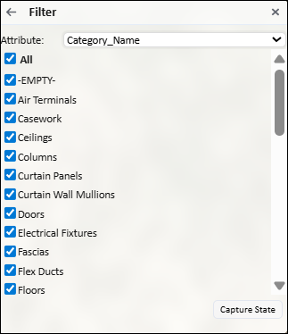 4. To retain the filtered view after closing the panel, click Capture State. This saves the filter settings to the model’s classification layer. To reset and show all elements again, reopen the dialog, select All and Capture State.