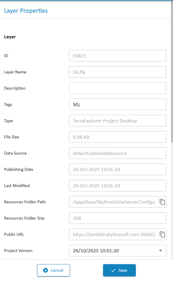 TerraExplorer projects (FLY layers) can be updated and saved back to SkylineGlobe Server while maintaining the same URL, using the "Update existing" publishing option. This ensures that users automatically get the latest version of the project. This option also maintains a history of all previous project iterations, offering the ability to revert to any prior version when necessary. In SGS Manager, you can select which version of a FLY layer should be served to TerraExplorer clients when loading the layer. By default, the latest version is served.