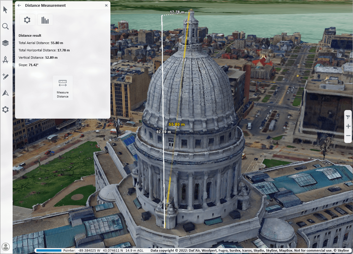 2.      Click any point on the terrain or on an object to define the start point of the measurement, and then click to set the second point. If Multiline is switched off in Settings, the measurement will automatically complete after two points. If Multiline is switched on, you can click to add additional segments, and then right-click to finish. If you want to delete the last point drawn, click Undo . By default, the aerial distance is displayed in the distance measurement panel as well as in the 3D Window. Use the switches in the Distance Settings panel to turn on/off the display of aerial, horizontal, and vertical distance measurements in the 3D Window. Aerial distances are marked as solid yellow lines, while horizontal and vertical distances are displayed as dashed white lines.