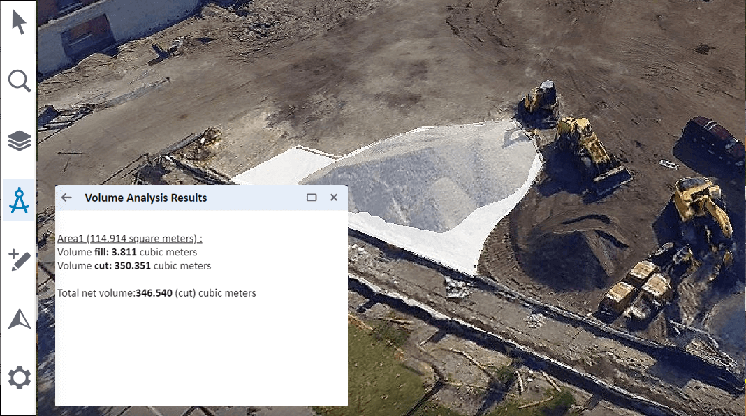 Analyze the volume of the terrain or model removed or added by drawn horizontal planes. This tool is only available in Chrome and Edge browsers.
