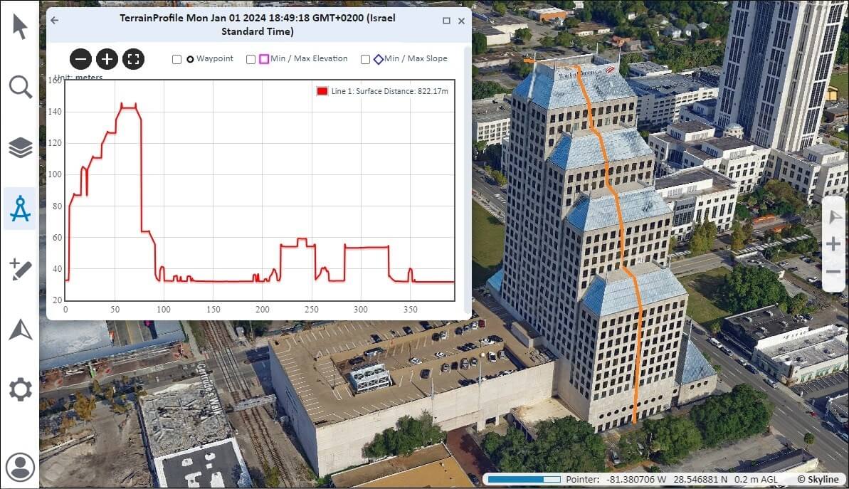 3.      If you want to calculate a terrain profile for the path defined by the line you drew, in the Distance Measurement panel, click Terrain Profile . When calculation is complete, a terrain profile graph is displayed, showing the terrain elevation profile. Turn on the information you want indicated on the graph: polyline waypoints, min/max altitude and max slope.