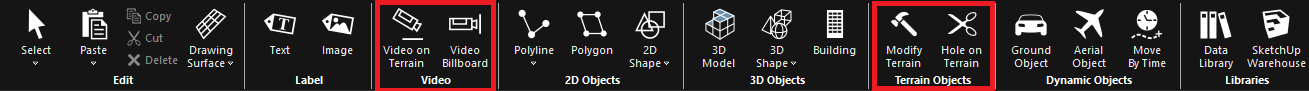 TerraExplorer provides a set of objects that affect the terrain. You can modify the terrain, create holes in the terrain and play a video file onto the terrain.