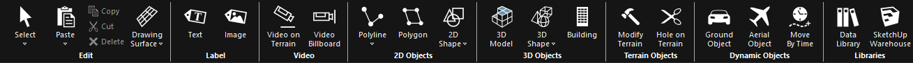 1. On the Objects tab, in the 2D Objects, 3D Objects and Dynamic Objects groups, click the object you want to create: