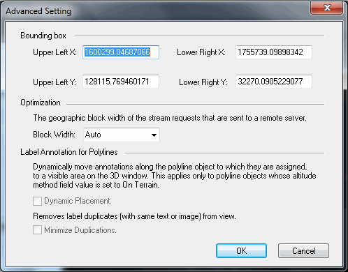 You can change the geographic block width of the stream requests that are sent from TerraExplorer to the remote server. Changing the block width can improve performance, For example, a block width that is about double the average line feature size, or covers about 50 point features, can improve streaming behavior. This field is enabled when the Load option in the Options section of the General Settings dialog is set to Streaming. Select one of the following options: § Auto: TerraExplorer Pro calculates dynamically the request block width according to performance related criteria. § Predefined Set of Block Width Suggestions: Select the block width in meters or kilometers. |