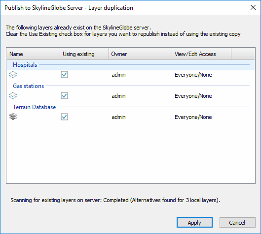 b. If you want to use existing layers on the server for layers for which a similar but not exact match was found, select their check boxes, and click Apply.