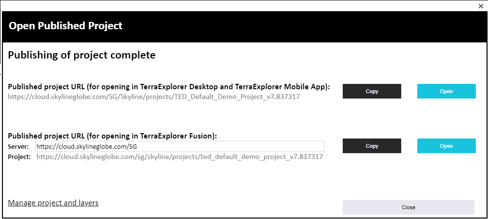 13. To copy a URL, click Copy next to the required URL. If you want to open the project in TerraExplorer Fusion, click Open next to the Fusion link. If you want to open the published project in the open Desktop application, click Open next to the Desktop/Mobile link.