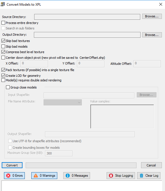 6. A single XPL file can be created for the lower resolution levels of multiple models that are in close proximity. This is particularly useful for small models. If you want to Group close models of XPL model files, select the check box, and enter the following information: