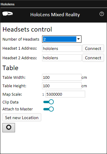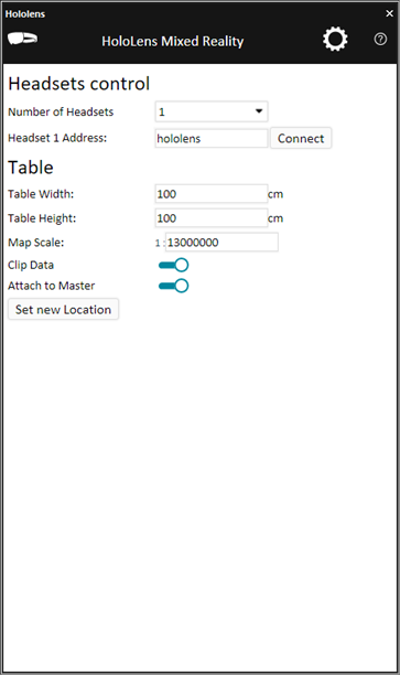 § Set the headset address and virtual table details: Set the properties in the HoloLens dialog. See property descriptions below.