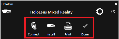 3. The HoloLens Mixed Reality dialog is displayed. If HoloLens was not yet set up, the HoloLens tool opens directly to a series of setup screens. You can navigate between these screens using the tabs at the top of the dialog: Connect, Install, Print, Done.