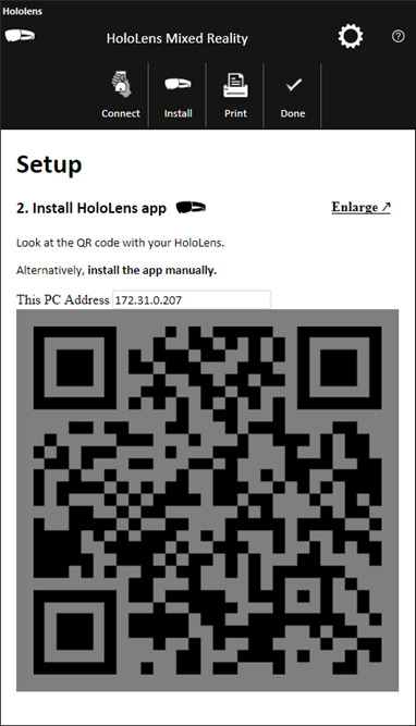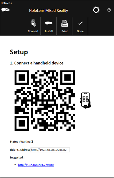 5. Connect a handheld device: The QR code in the dialog updates to the selected IP. Scan the QR code with the handheld device (e.g., phone) you intend to use as a controller for HoloLens, to make sure that your device is connected to the same network. Then click the Install tab at the top of the dialog on your computer.