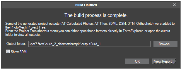 Note: The output folder can also be opened at any time from the Build Outputs list. See "Opening Build Output in TerraExplorer" in this chapter for more information.