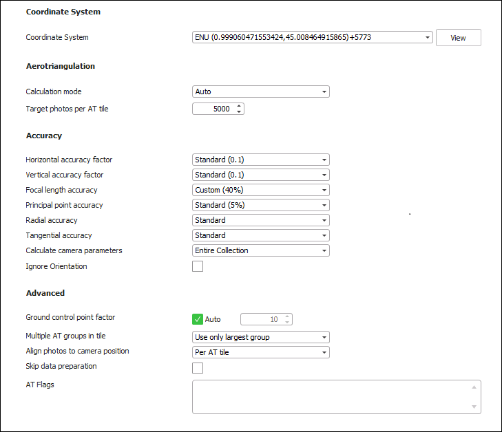 Project’s internal coordinate system, in which the aerotriangulation and reconstruction are performed. By default, this is set to the coordinate system of the input data. If the inputted data uses multiple coordinate systems, or you want to use a different coordinate system from your input’s, select the required coordinate system. Select the Custom option to create a new custom coordinate system. See "Coordinate System" in the "Basic Concepts" chapter for more information. Note: Click View to view the full Well-Known Text (WKT) for the coordinate system. |