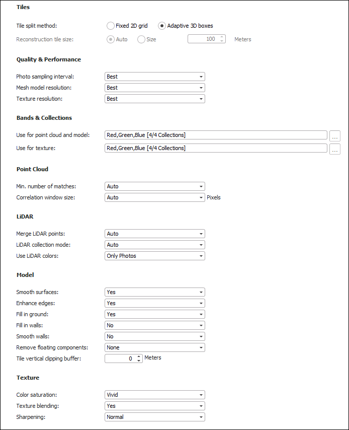 You can select the collections to include when generating the mesh model texture, orthophoto, or point cloud, as well as the bands to include in the orthophoto and to assign to each RGB of the mesh model texture. See "Setting Advanced Reconstruction Parameters" in the "Building" chapter for more information.