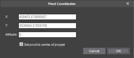 Setting the pivot for a DAE/OBJ/OSGB model improves the stability of its display in 3rd party viewers that are limited regarding display of large coordinates. A DAE/OBJ/OSGB model’s pivot can be set to the project’s center or set to custom coordinates.